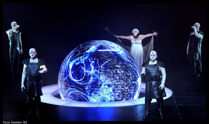 In Tiran’s interpretation, “Salome is the sun in a world without sun, she is a young woman searching for meaning and finding her purpose in destruction that is intended as a precursor to rebuilding and healing. The world in which she exists is a dark one in which all human resources and value systems have been destroyed, while she, the sun, is the source of the moon’s light as it reflects her, and the moon, therefore, occupies a central place onstage.” The famous Dance of the Seven Veils, choreographed by Renana Raz, takes on a new meaning, according to Itay Tiran – it is not only a moment of seduction, but a ritual act, through which Salome discovers her power, in her search for meaning. The set design by Eran Atzmon and costume design by Orna Smorgonsky contribute to the post-modern, almost dystopic feel of the production, as do the lighting by Avi Yona Bueno (Bambi), and the video art by Yoav Cohen, which turns the moon into an active and ominous presence onstage.